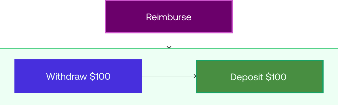 In this sample application, money comes out of one account and goes into another. However, there are a few things that can go wrong with this process. If the withdrawal fails, then there is no need to try to make a deposit. But if the withdrawal succeeds, but the deposit fails, then the money needs to go back to the original account.